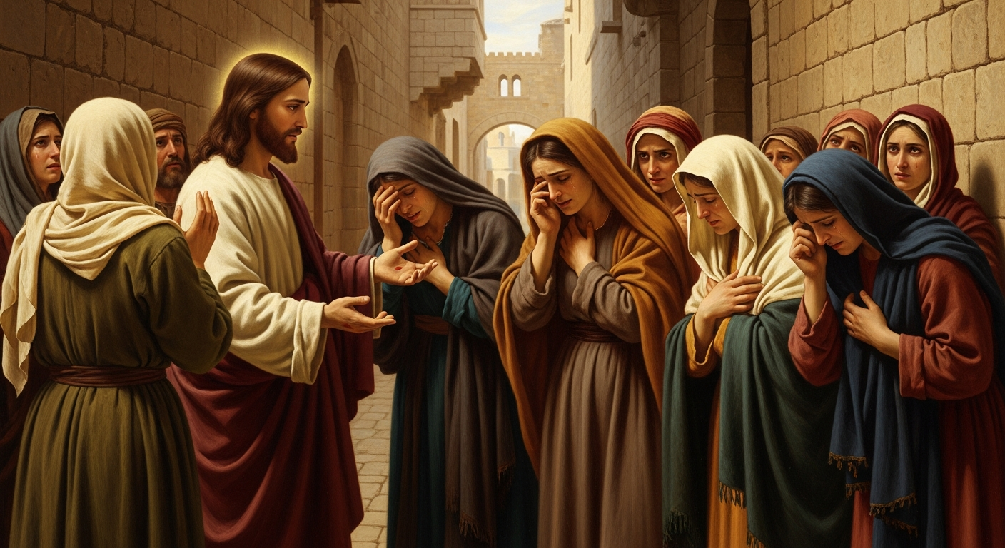 Betrachtung: Frauen folgen ihm und weinen. Jesus verweigert ihr Mitleid – nicht aus Gleichgültigkeit, sondern weil er die Zukunft kennt. Sein Leiden ist nicht das größte Leiden, das kommt. Jesus lehrt: dass echte Fruchtbarkeit nicht biologisch, sondern geistlich ist.