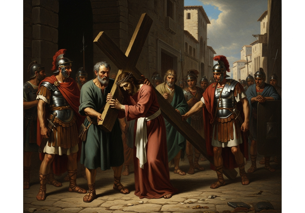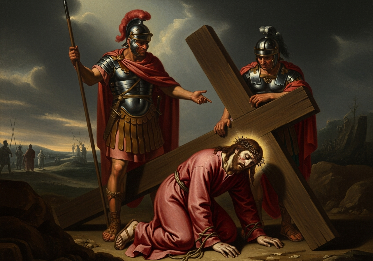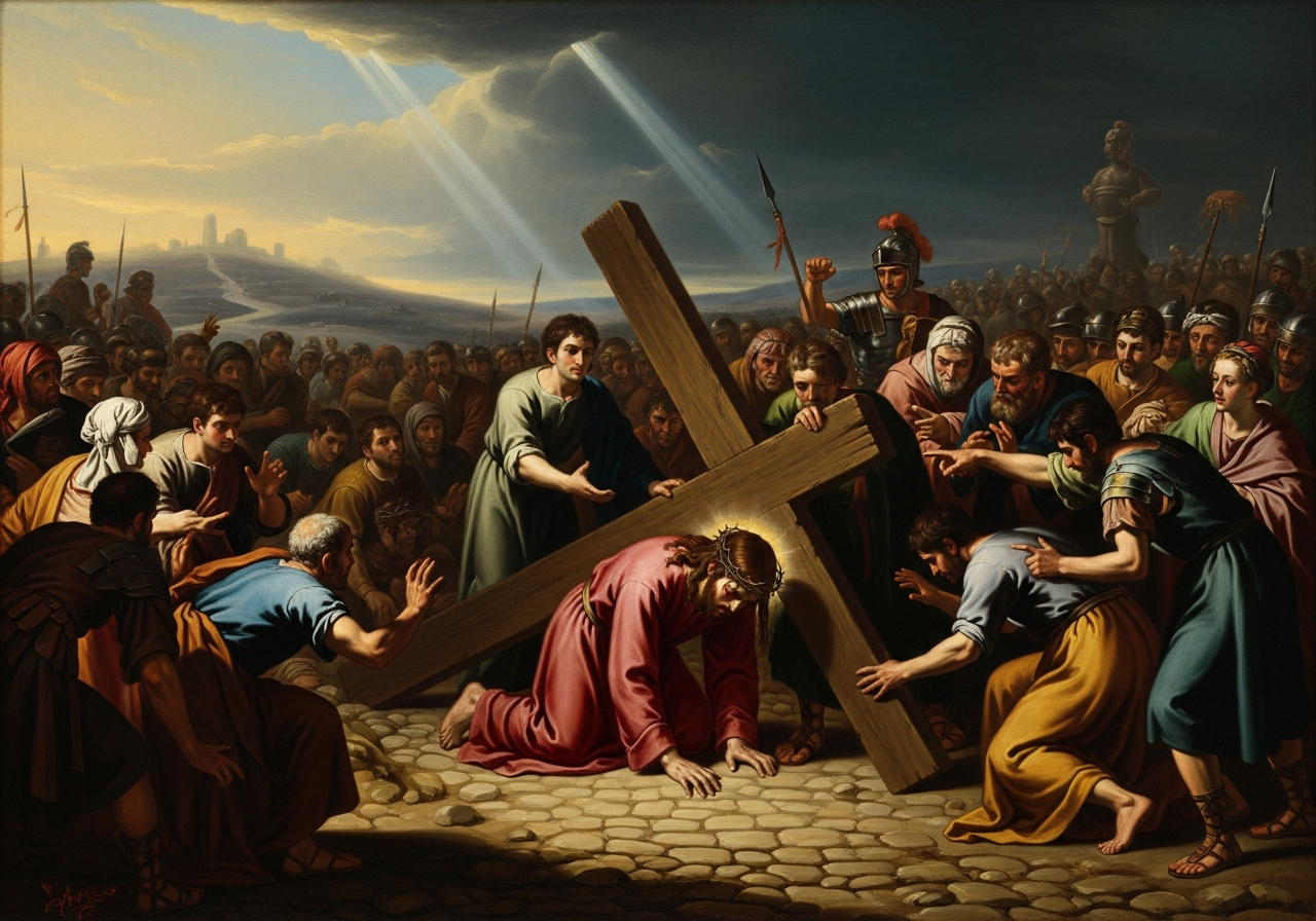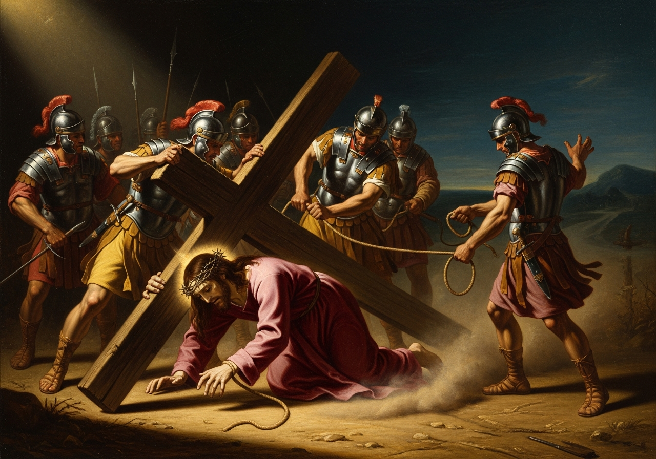 Betrachtung: Das Kreuz wird ihm auf die Schultern gelegt – schwer, rau. Doch Jesus trägt es nicht widerstrebend, sondern als Ausdruck seiner Liebe. Dies ist das Paradoxon: Was die Welt als Schande sieht, wird zum Symbol der Erlösung.