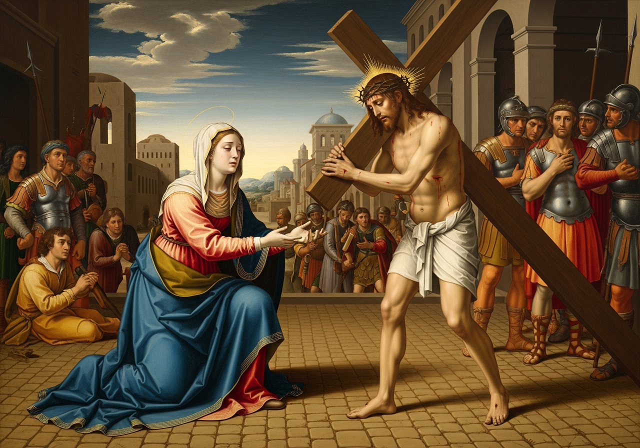 Betrachtung: Maria trifft ihren Sohn auf dem Weg zum Tode. Ein Schwert durchbohrt ihre Seele – die Prophezeiung des Simeon erfüllt sich. Ein Blick zwischen Mutter und Sohn – mehr Worte sind nicht nötig. Jeder Atemzug sagt: "Ich liebe dich. Es ist gut. Vertrau."