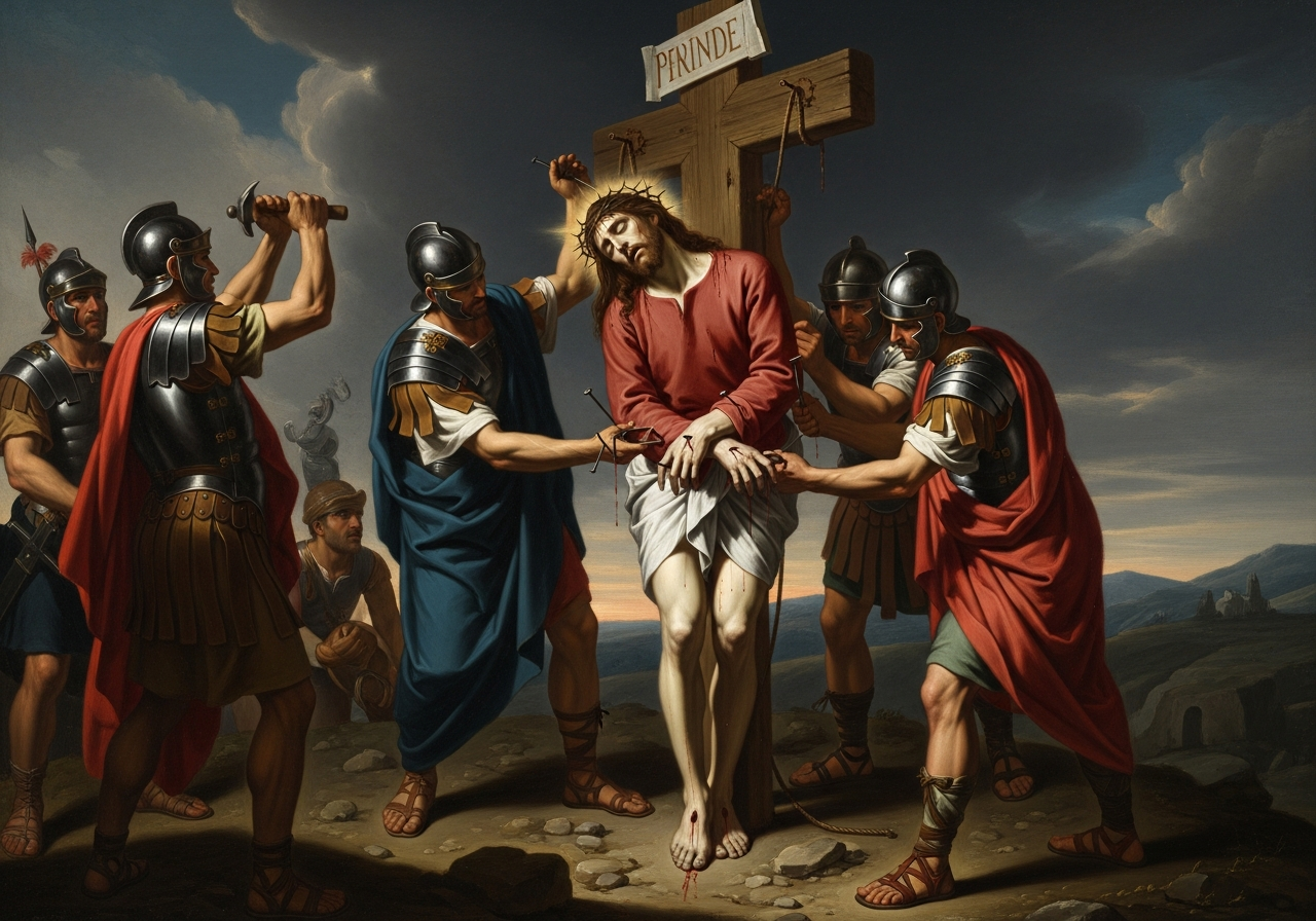 Betrachtung: Die Nägel durchbohren – nicht schnell, sondern langsam. In diesem Moment der äußersten physischen Qual offenbart sich Jesus als das, was er wirklich ist: Gott in seiner reinen, nackten Liebe. Crucifixion war die Strafe für Sklaven. Der König der Könige stirbt wie der niedrigste Sklave – die umgekehrte Hierarchie des Gottesreichs.