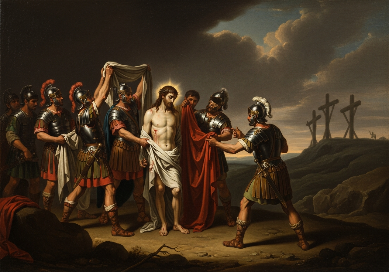 Meditation: Du wirst entblößt, exponiert. Und doch bleibt deine Würde unangetastet. Deine Würde kommt von innen – von deiner Liebe, deinem Opfer. Lehre mich, meine Würde nicht in Besitz oder Ansehen zu finden.