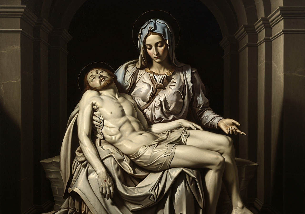 Betrachtung: Maria hält den toten Körper ihres Sohnes. Dies ist die Pietà – das tiefste Bild der Mutterleid. Es gibt keinen Trost. Nur der stumme Schmerz einer Mutter. Und doch offenbart sich der Glaube Marias: Der Leib wird zärtlich behandelt, wird gewaschen – aus Liebe. Der tiefste Glaube ist oft der, der weint und die Last trotzdem trägt.