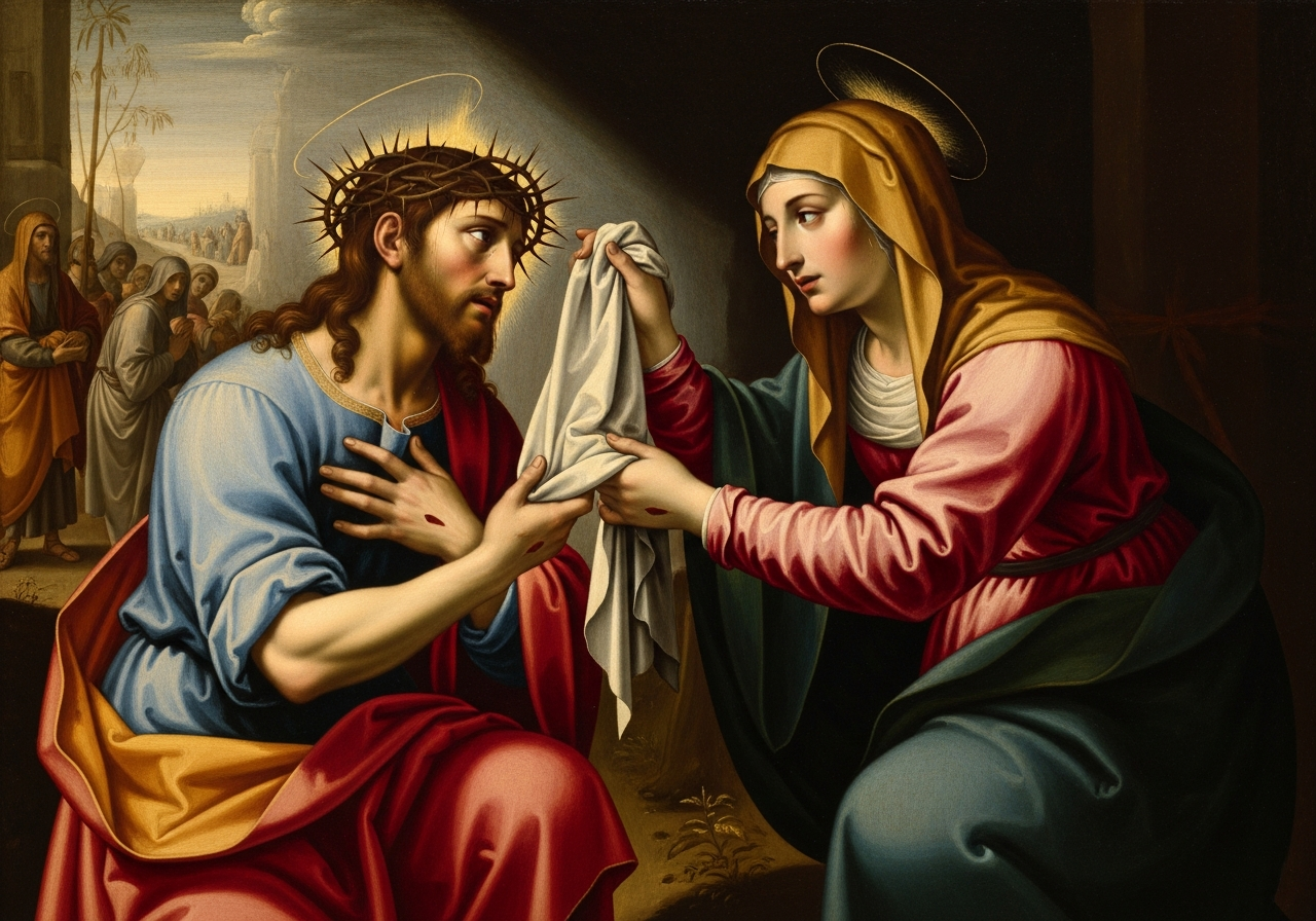 Betrachtung: In einer Welt der Grausamkeit gibt es einen Moment der Zärtlichkeit. Veronika sieht nicht einen Verbrecher – sie sieht einen Menschen im Leiden. Sie opfert ihr Tuch. Die Tradition sagt, dass sein Gesichtsbild auf ihrem Tuch blieb – ewiges Zeugnis ihrer Liebe.