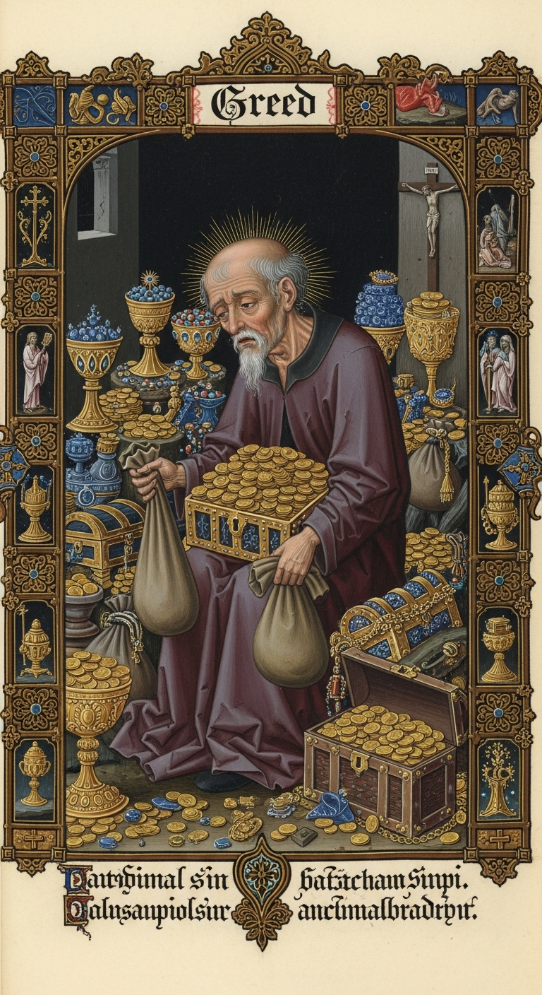 Geiz (lateinisch: avaritia) ist die unbezähmte Begierde nach Reichtum. Es ist nicht die Sorge um die eigene Familie oder die legitime Arbeit für Wohlstand. Der Geiz ist die obsessive Liebe zum Geld selbst, die Anhäufung von Besitz über alles andere, sogar über Gott und andere Menschen.